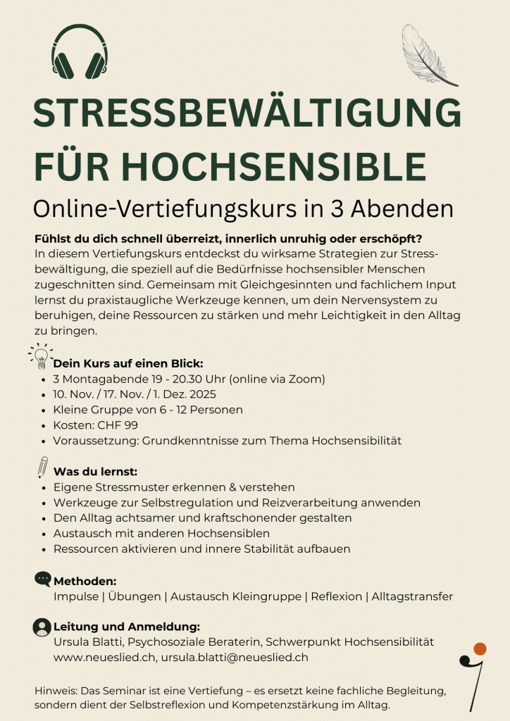 Im Online-Vertiefungskurs „Stressbewältigung für Hochsensible“ entdeckst du wirksame Strategien zur Stressbewältigung, die speziell auf die Bedürfnisse hochsensibler Menschen zugeschnitten sind. Gemeinsam mit Gleichgesinnten und fachlichem Input lernst du praxistaugliche Werkzeuge kennen, um dein Nervensystem zu beruhigen, deine Ressourcen zu stärken und mehr Leichtigkeit in den Alltagzu bringen.