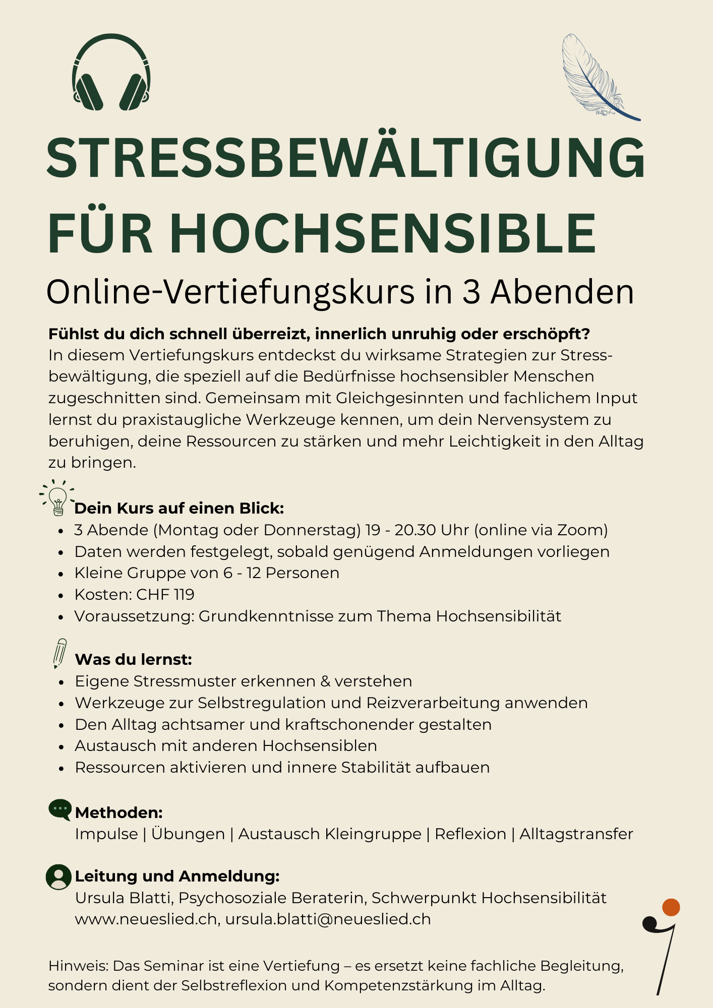 Im Online-Vertiefungskurs „Stressbewältigung für Hochsensible“ entdeckst du wirksame Strategien zur Stressbewältigung, die speziell auf die Bedürfnisse hochsensibler Menschen zugeschnitten sind. Gemeinsam mit Gleichgesinnten und fachlichem Input lernst du praxistaugliche Werkzeuge kennen, um dein Nervensystem zu beruhigen, deine Ressourcen zu stärken und mehr Leichtigkeit in den Alltag zu bringen.